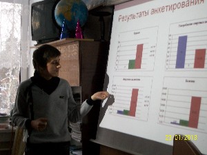 • Ученик 11 класса Черных Антон  провёл исследование среди учащихся школы по здоровому образу жизни и представил   работу «Здоровый образ жизни». Научный руководитель – Вертешина Елена Фёдоровна.